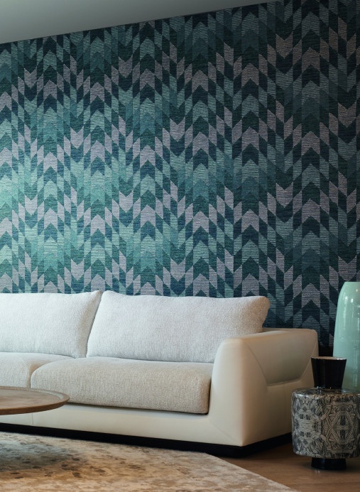 Die Textiltapete zeigt ein markantes Muster aus Chevron-Elementen. Eine Kombination aus knisterndem Raphiabast-Imitat und Baumwolle, wird bei der Produktion zu einem prächtigen Muster verwoben. Es erinnert an den Blick durch ein Kaleidoskop. Die strukturierte Oberfläche unterstreicht die textile Anmutung und bringt Tiefe in den Raum.