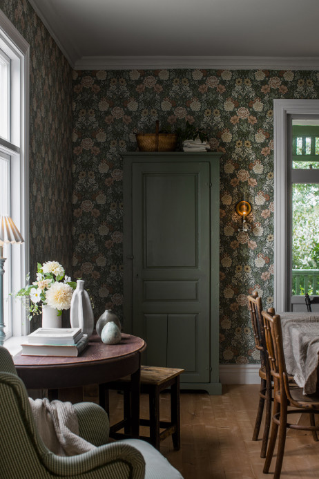Die typisch skandinavische Tapete erweckt die üppige Schönheit schwedischer Spätsommertage zum Leben. Sie zeigt ineinandergeschlungene Blumen und Blätter. Umgesetzt wurde das Design mit einer leichten Jugendstil-Note. Dank einer speziellen Drucktechnik besitzt sie eine traditionelle Haptik.