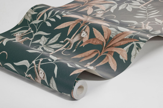 Die Tapete lädt Kinder zu Abenteuern ein. Affen schaukeln und Palmen wachsen die Wände hinauf und sorgen für ein verspieltes und dennoch skandinavisch harmonisches Design.