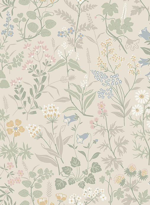 Die florale Tapete zeigt ein dichtes Blumenmuster aus wunderschönen Blüten, die sich auf einem ruhigen Hintergrund über die Wand schlängeln. Das zarte Design erinnert an eine schwedische Frühlingswiese und verleiht der Wand eine frische und lebhafte Optik. Die skandinavische Vintage-Tapete ziert anmutig die Wand und sorgt für einen eleganten skandinavischen Stil in Wohn- und Schlafräumen.