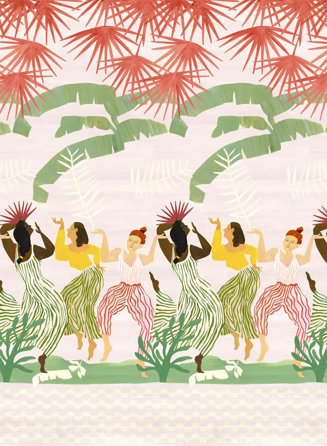Die Panoramatapete zeigt eine lebhafte Szene mit stilisierten Figuren in fließenden Gewändern, die sich rhythmisch entlang eines dekorativen Streifens bewegen. Darüber erstrecken sich abstrahierte Palmblätter, die dem Muster Dynamik verleihen. Drei Freundinnen, die vor Freude und Begeisterung aus Leib und Seele tanzen. Freundschaften beruhen oft auf Gemeinsamkeiten, Sympathie und Vertrauen. Dieses Muster feiert die 25-jährige Zugehörigkeit von Chivasso zur Jab Anstoetz Group.