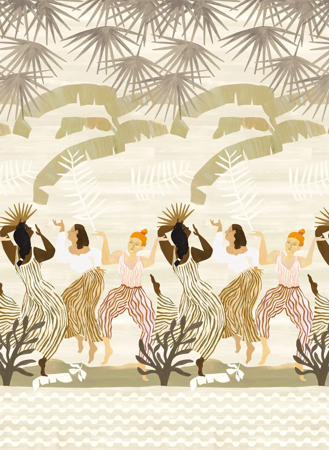 Die Panoramatapete zeigt eine lebhafte Szene mit stilisierten Figuren in fließenden Gewändern, die sich rhythmisch entlang eines dekorativen Streifens bewegen. Darüber erstrecken sich abstrahierte Palmblätter, die dem Muster Dynamik verleihen. Drei Freundinnen, die vor Freude und Begeisterung aus Leib und Seele tanzen. Freundschaften beruhen oft auf Gemeinsamkeiten, Sympathie und Vertrauen. Dieses Muster feiert die 25-jährige Zugehörigkeit von Chivasso zur Jab Anstoetz Group.