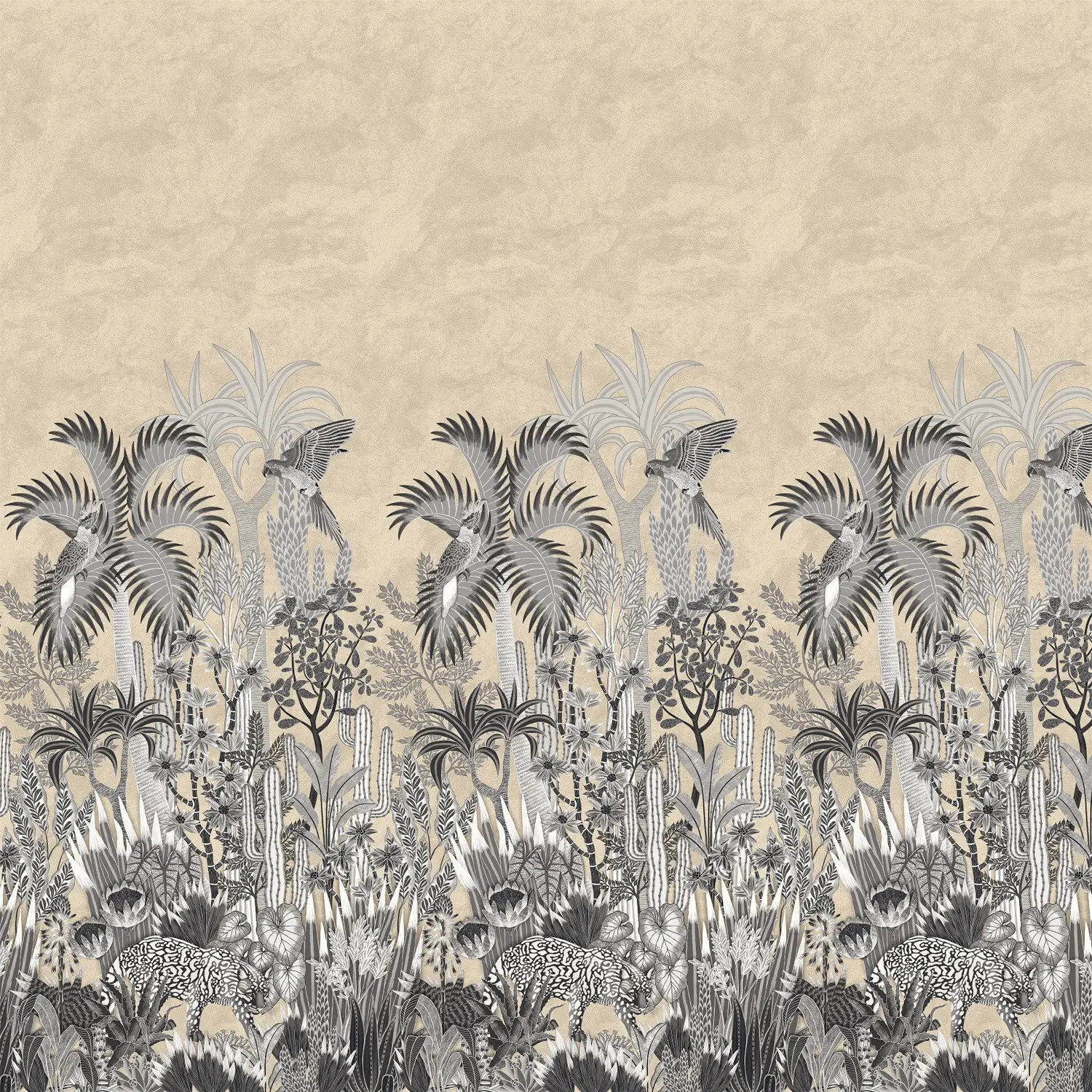 Die Panoramatapete zeigt eine dichte, üppige Komposition aus verschiedenen Pflanzen, Kakteen und exotischen Tieren, die sich zu einem lebendigen Gesamtbild verbinden. Die einzelnen Elemente sind reich detailliert, gleichmäßig über die Fläche verteilt und bilden eine atemberaubende Dschungellandschaft. Ein dezenter metallischer Schimmer sorgt je nach Lichteinfall für eine leichte Reflexion. Die tropische Waldlandschaft mit Ihrer vielfältigen Flora und Fauna wie auch feinste Details der Papageien, des Panters, der Blüten und Blätter kommen in 400 cm Höhe wunderschön anmutend zur Geltung. Das Muster verzaubert die Sinne und bietet die perfekte Kulisse für eine atemberaubende Wandgestaltung.