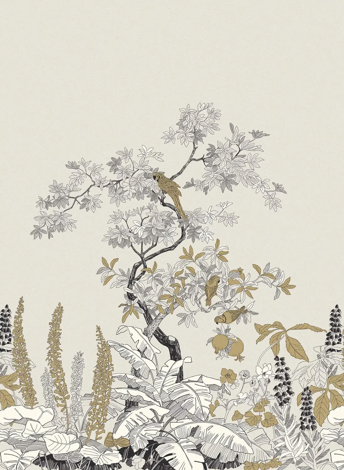 Die Panoramatapete zeigt eine detailreiche Landschaft mit exotischen Pflanzen und fand Inspiration in der linearen Bleistifttechnik klassischer Toile-de-Jouy-Tapeten. Die ruhige, stilisierte Naturlandschaft mit ihren filigranen reduzierten Blüten-, Blatt- und Baummotive wirken subtil und raffiniert. Ein dezenter metallischer Schimmer sorgt je nach Lichteinfall für eine leichte Reflexion. Die feinen Linien und sanften Farbtöne verleihen dem Muster eine elegante Leichtigkeit. Dadurch entsteht im Raum eine entspannte, harmonische Atmosphäre, die Natürlichkeit und Ausgeglichenheit ausstrahlt.