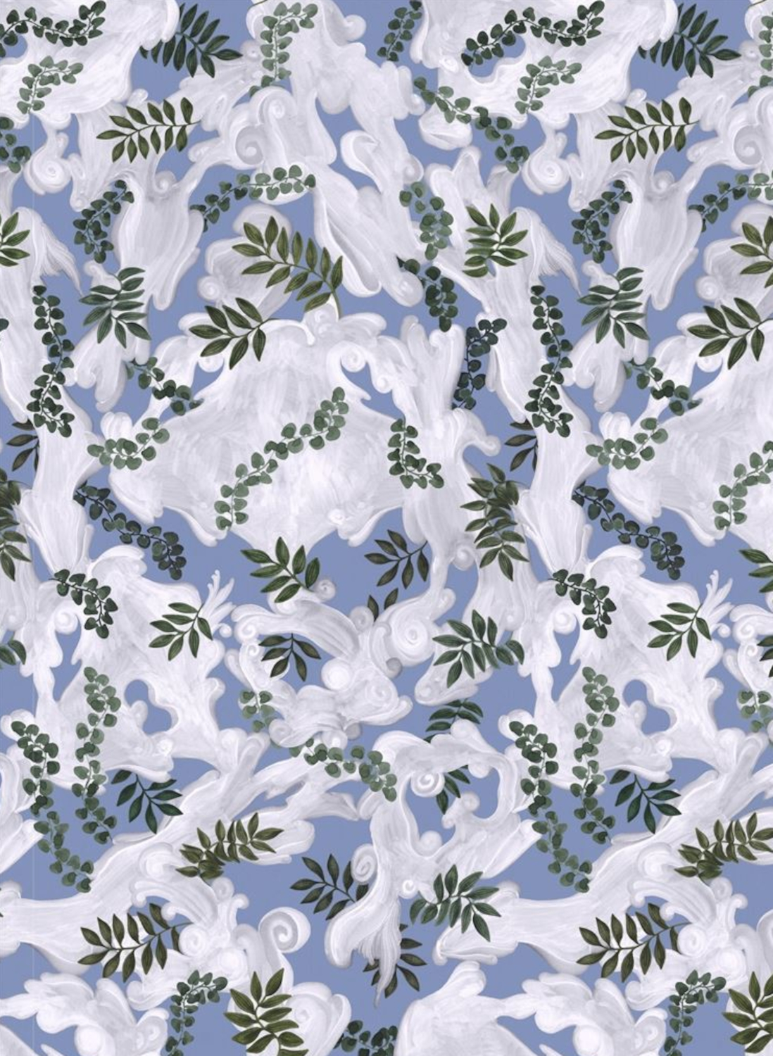 Die Tapete zeigt ein verspieltes Muster aus ornamentalen Wolken, die von Blätterranken durchzogen sind. Der sanfte Farbton im Hintergrund setzt die filigranen Formen im Vordergrund kunstvoll in Szene und verleiht dem Muster eine raffinierte Tiefe. Blätter und zarte Eukalyptuszweige sorgen für einen harmonischen Kontrast, der eine natürliche und zugleich elegante Wirkung erzeugt.