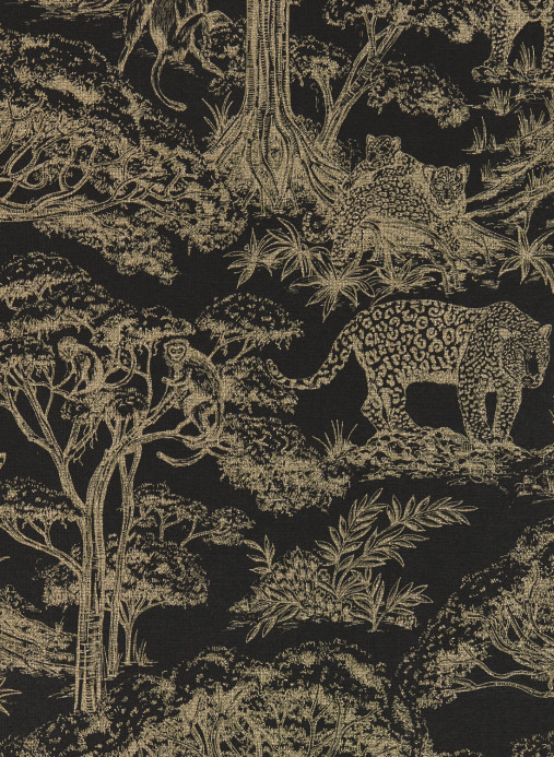 Die Tapete zelebriert die Landschaft und Tierwelt der afrikanischen Steppe. Das handgezeichnete Toile-de-Jouy-Design, wirkt durch Metallic-Effekte bei den Farbgebungen Midnight und Noir besonders kraftvoll.