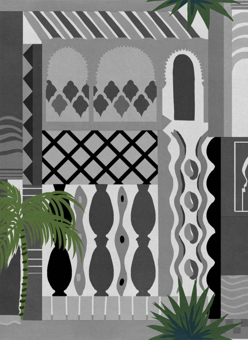 Die Tapete zeigt architektonische Elemente eines orientalischen Hauses, vor dem tropische Vegetation gedeiht. Das geometrische Design verleiht der Wand Tiefe. Gitterelemente und Vasen sorgen für eine exotische Note in Wohn- und Schlafräumen.