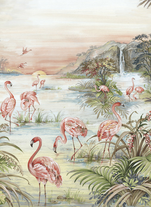 Der Flamingo ist ein Symbol für Sommer, Sonne und Romantik. Mit seinem extraordinären leuchtenden Federkleid, elegant auf langen Beinen stolzierend, verwandelt er jeden Raum in einen Sehnsuchtsort. Das Wandbild mit Bergen und Wasserfall im Hintergrund zeigt etliche dieser schönen Vögel, im Wasser watend sowie fliegend. Die Pflanzenwelt mit Bambus und Palmen sorgt für asiatische Anklänge.