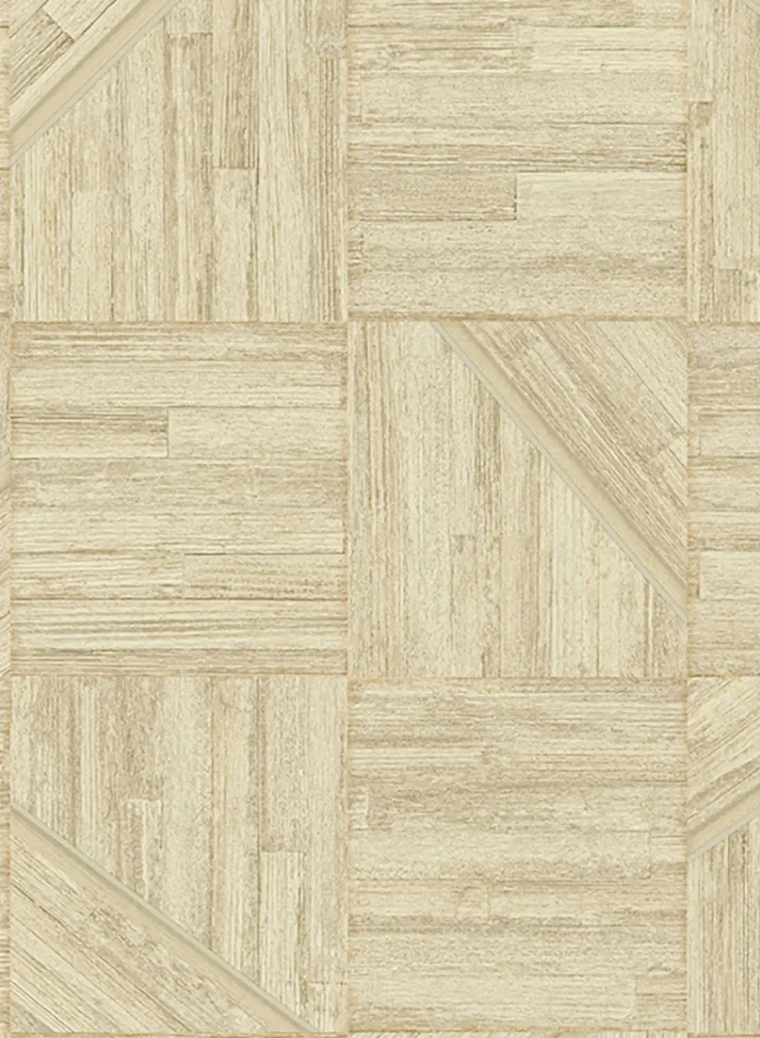 Die Vinyltapete zeigt ein geometrisch angeordnetes Muster aus unterschiedlich ausgerichteten Holzstrukturen. Die wechselnden Richtungen der Maserung verleihen der Wand Lebendigkeit und einen modernen, zugleich wohnlichen Charakter. Das hochwertige Vinyl sorgt für eine Haptik, die dem Original täuschend echt nachempfunden ist. Die Prägung bring Tiefe an die Wand.