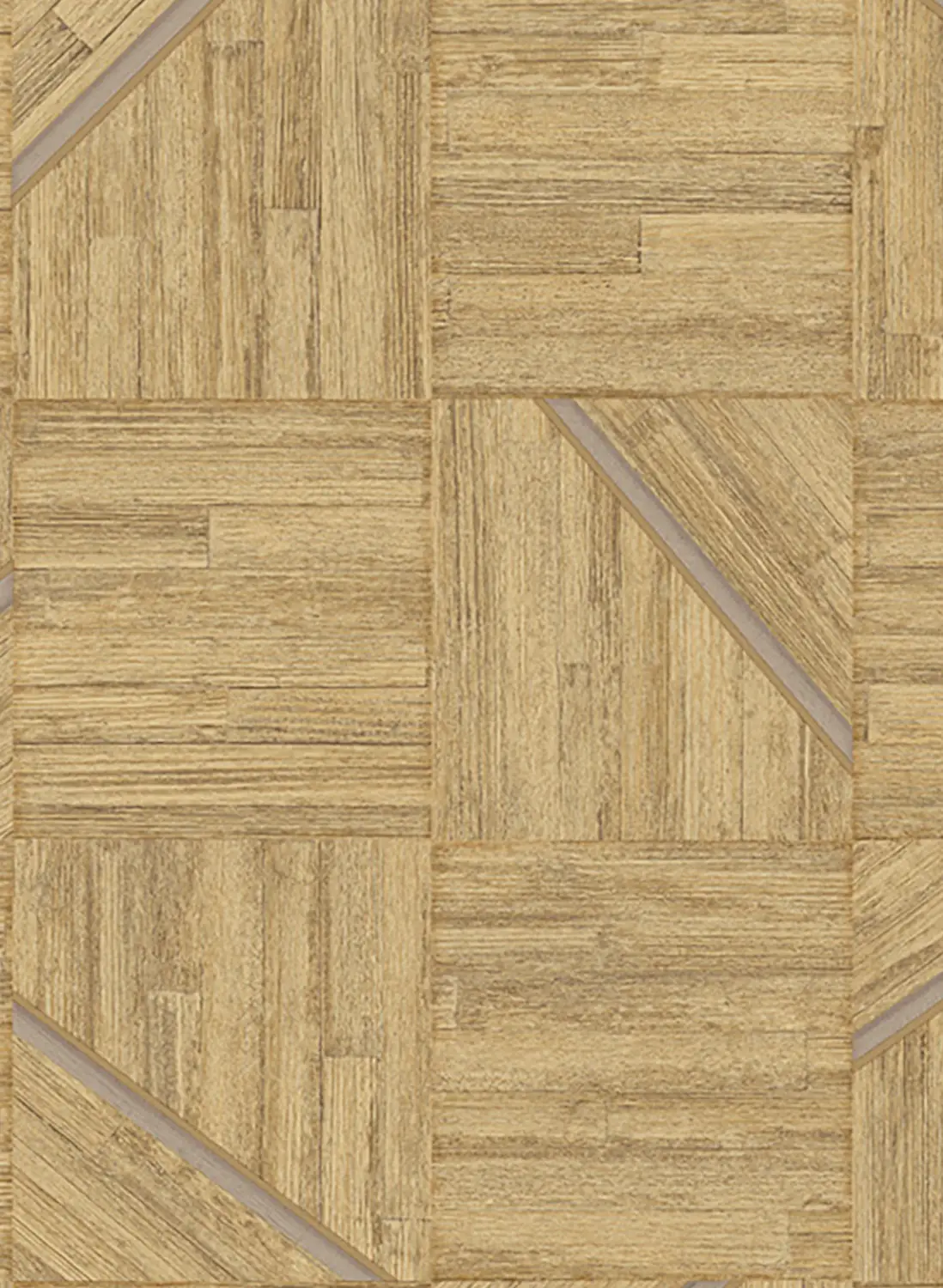 Die Vinyltapete zeigt ein geometrisch angeordnetes Muster aus unterschiedlich ausgerichteten Holzstrukturen. Die wechselnden Richtungen der Maserung verleihen der Wand Lebendigkeit und einen modernen, zugleich wohnlichen Charakter. Das hochwertige Vinyl sorgt für eine Haptik, die dem Original täuschend echt nachempfunden ist. Die Prägung bring Tiefe an die Wand.
