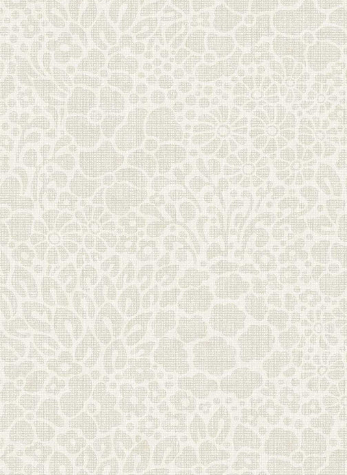 Die Vintage-Tapete zeigt abstrakte Blumenmuster. Die Haptik erinnert an Jute. Die organischen Farben bringen Wärme in den Raum.