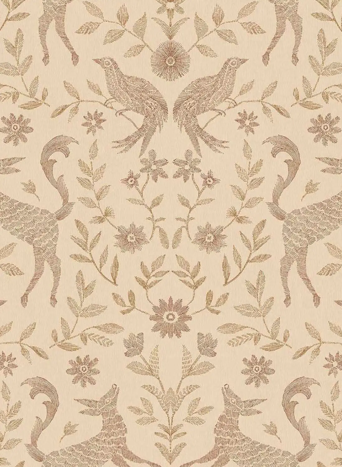 Die Tapete zeigt ein symmetrisch angeordnetes Muster aus Pflanzen, Vögeln und anderen Tieren. Die einzelnen Elemente sind aus feinen Strichen gezeichnet. Die ruhige Struktur und die dezente Farbgebung verleihen dem Raum eine elegante und zugleich wohnliche Atmosphäre.