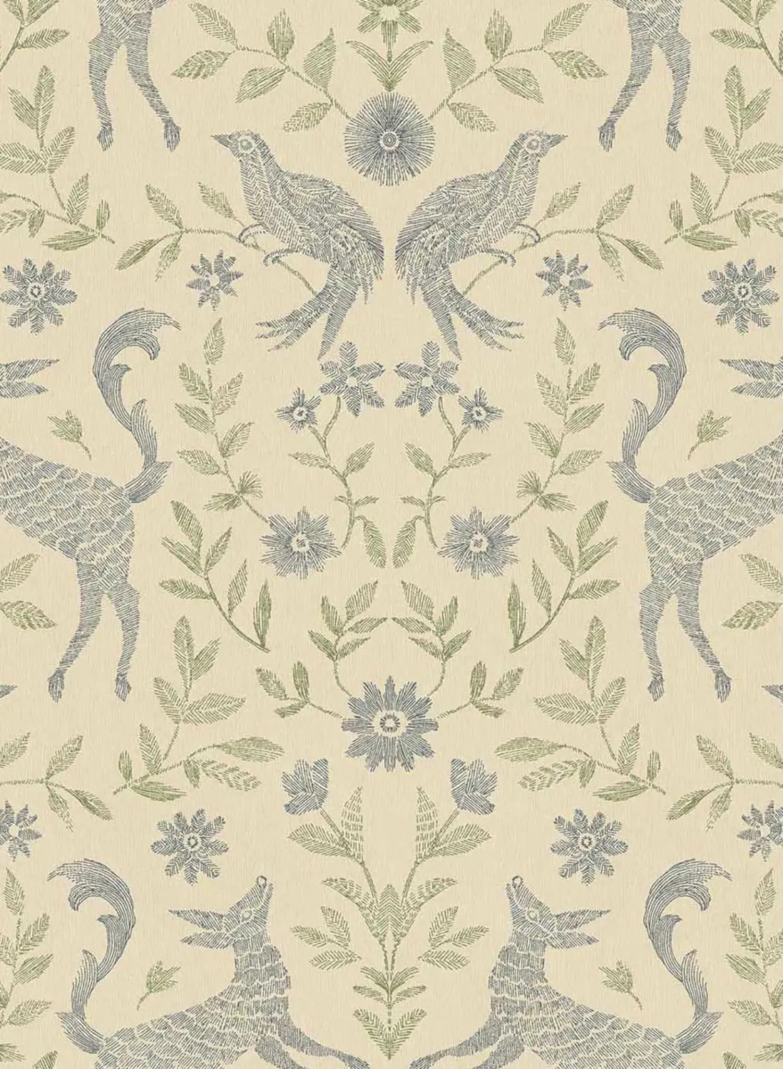 Die Tapete zeigt ein symmetrisch angeordnetes Muster aus Pflanzen, Vögeln und anderen Tieren. Die einzelnen Elemente sind aus feinen Strichen gezeichnet. Die ruhige Struktur und die dezente Farbgebung verleihen dem Raum eine elegante und zugleich wohnliche Atmosphäre.