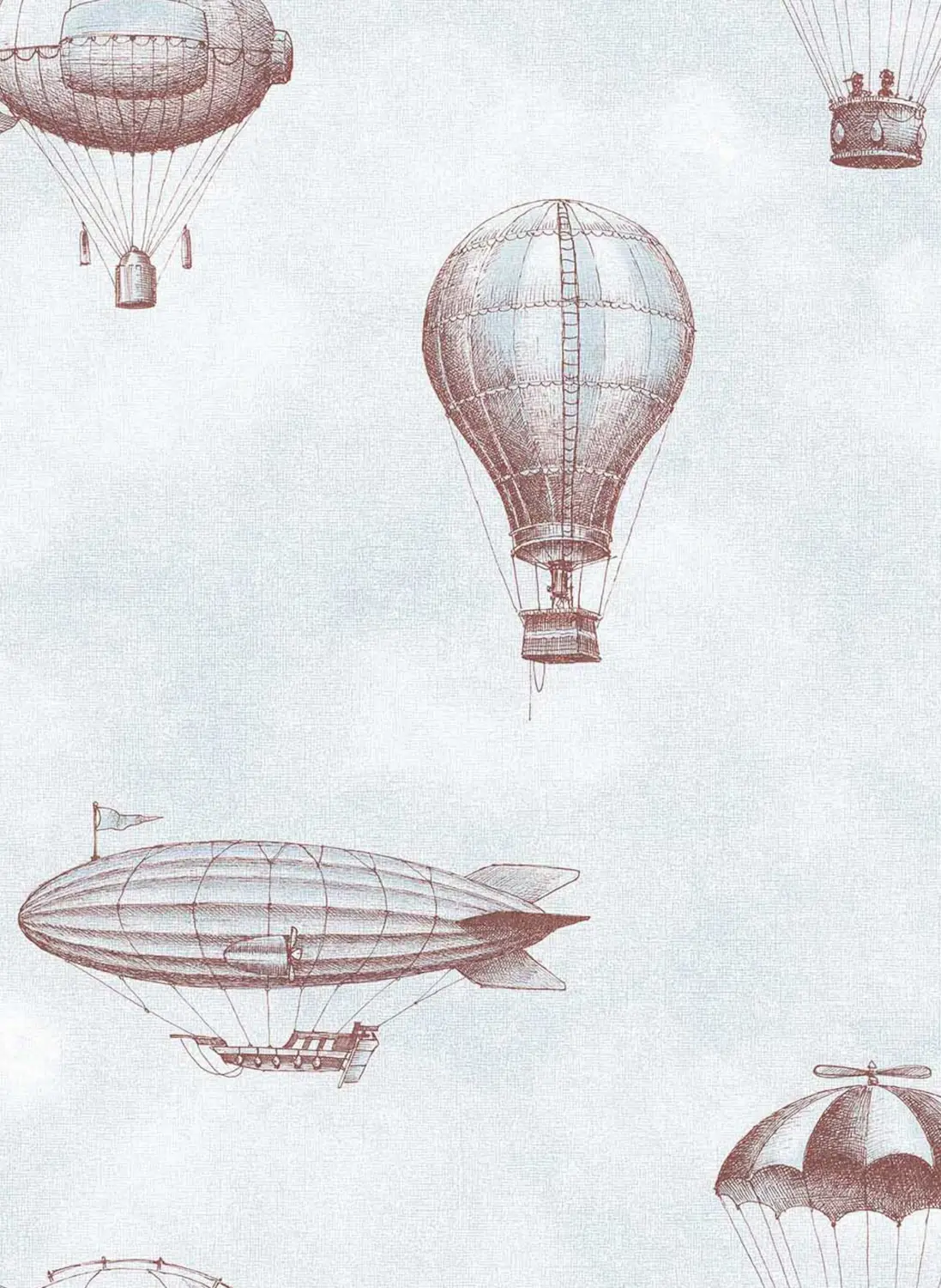 Die Tapete zeigt filigran gezeichnete Heißluftballons und Luftschiffe, locker über die Fläche verteilt. Das luftige Muster schafft eine leichte, verspielte Stimmung und bringt eine sanfte Weite in den Raum.