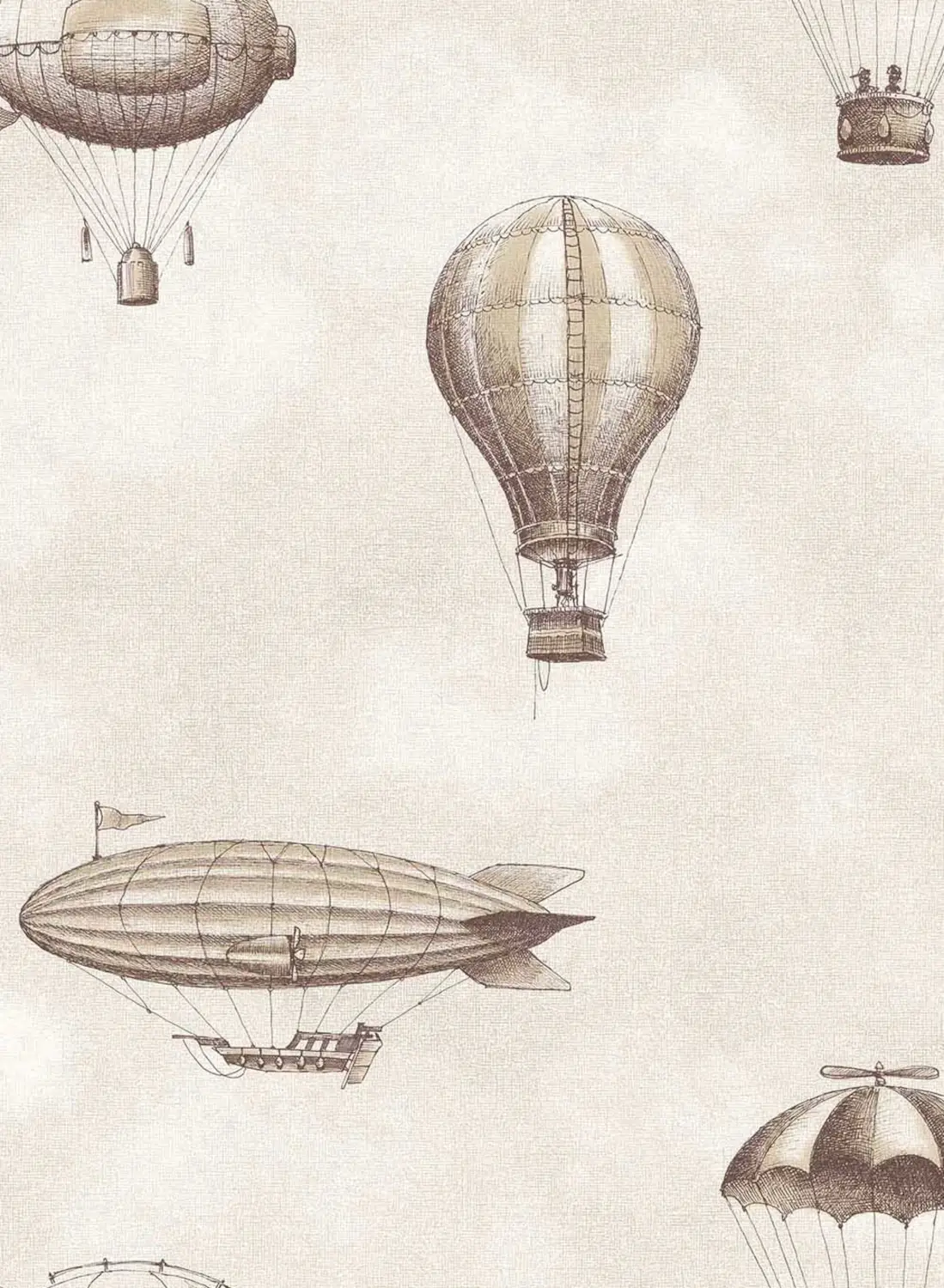 Die Tapete zeigt filigran gezeichnete Heißluftballons und Luftschiffe, locker über die Fläche verteilt. Das luftige Muster schafft eine leichte, verspielte Stimmung und bringt eine sanfte Weite in den Raum.