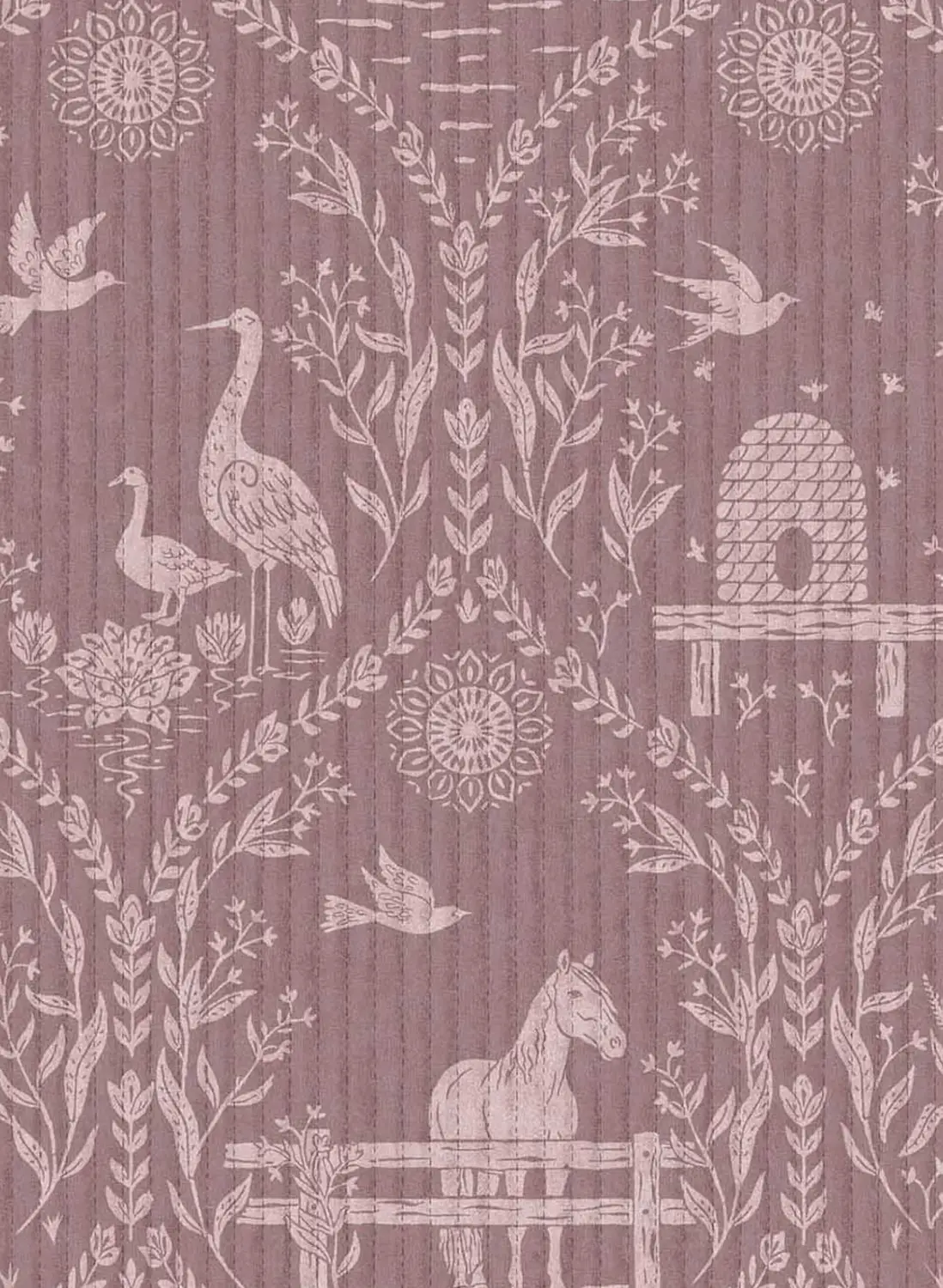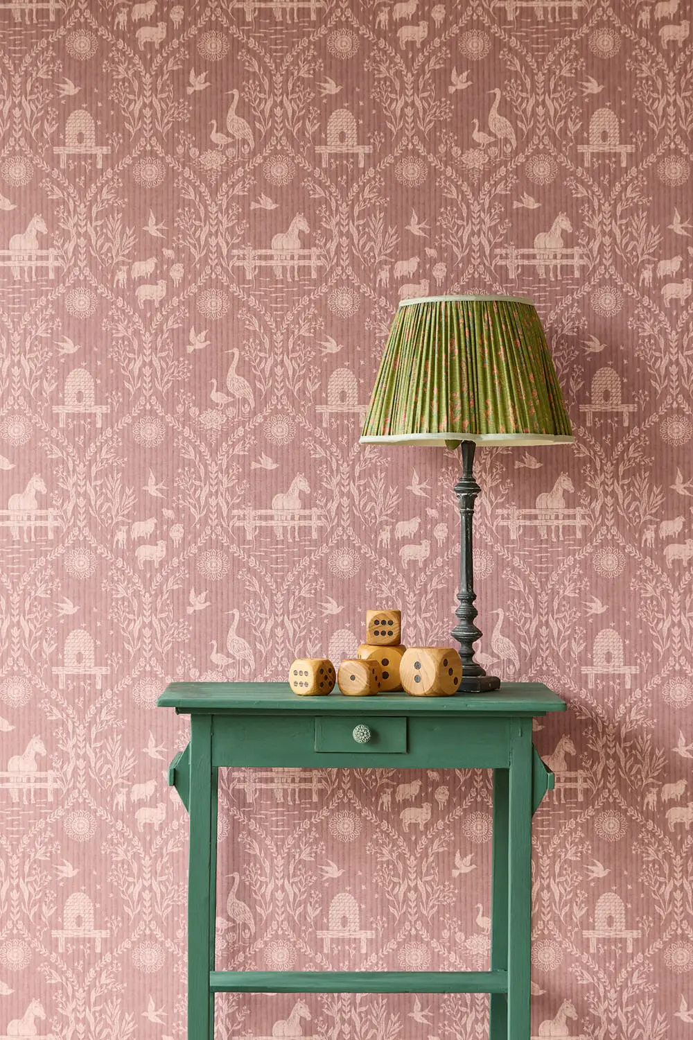 Die Tapete zeigt ein detailreiches Muster aus Tieren, Pflanzen und dekorativen Elementen auf gestreiftem Untergrund. Die gleichmäßige Verteilung wirkt lebendig und zugleich ausgewogen und verleiht dem Raum eine warme, erzählerische Atmosphäre.
