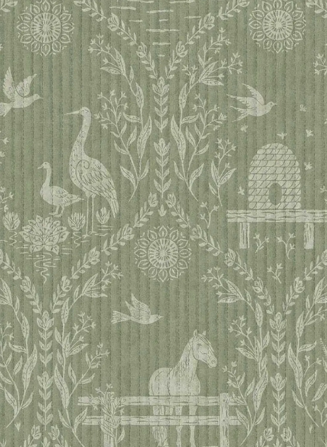 Die Tapete zeigt ein detailreiches Muster aus Tieren, Pflanzen und dekorativen Elementen auf gestreiftem Untergrund. Die gleichmäßige Verteilung wirkt lebendig und zugleich ausgewogen und verleiht dem Raum eine warme, erzählerische Atmosphäre.