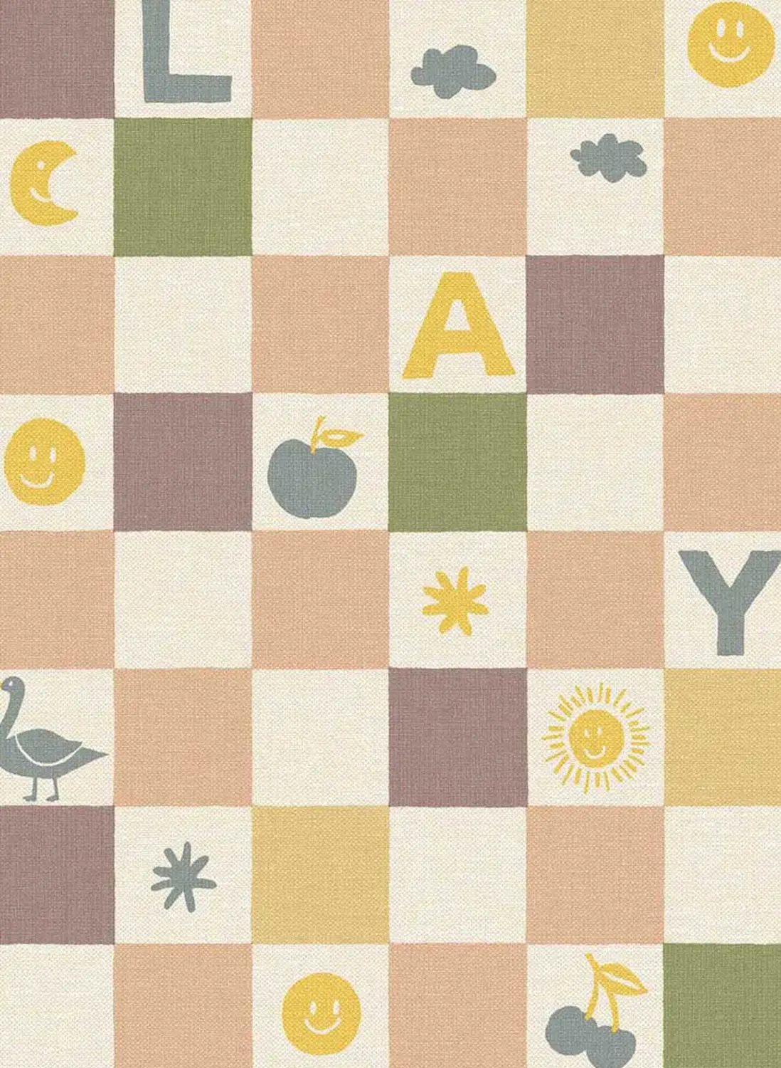 Die Tapete zeigt ein kariertes Muster mit eingestreuten kleinen Symbolen und Formen. Die klare Struktur kombiniert mit verspielten Details bringt Leichtigkeit und eine freundliche Stimmung in den Raum.