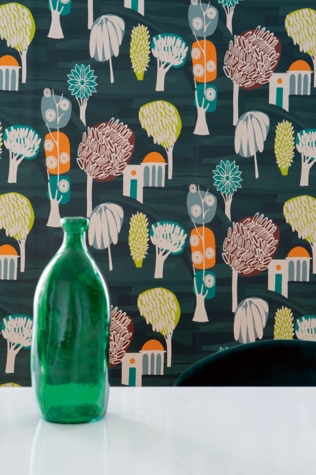 Das Muster der matten Vliestapete ist vom Mid-Century-Design inspiriert. Abstrahierte Bäume und Gebäude bilden eine Landschaft, die das Motiv dank einer markanten Vintage-Farbgebung zu einem Statement-Muster machen.