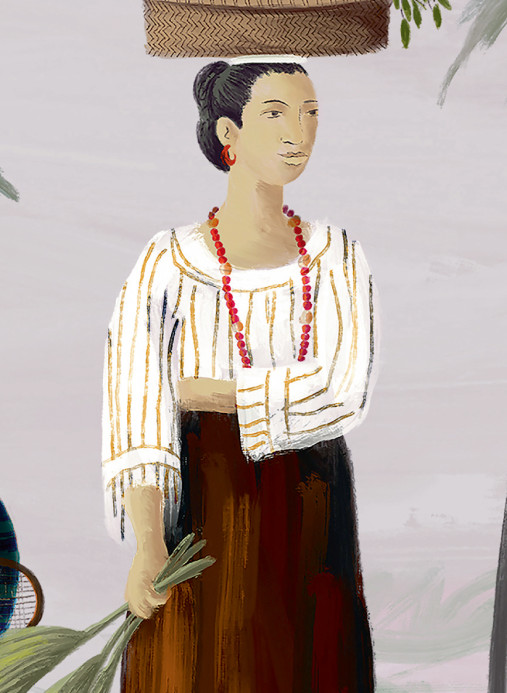 Die Panoramatapete zeigt eine wunderschöne Küstenlandschaft voller bunter Figuren. Ein weiter Strand aus feinem, weißem Sand erstreckt sich über die Wand und vergrößert so den Raum optisch. Zusammen mit dem Meer im Hintergrund sorgt die lebhafte Szene für Tiefe an der Wand und einen räumlichen Effekt. Das ausdrucksstarke Design setzt Akzente.