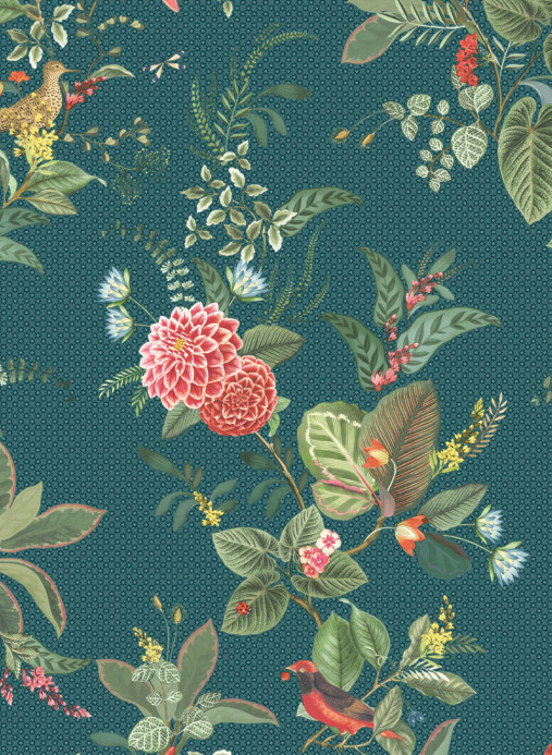 Beim bunten, floralen Design dieser matten Tapete mit tropischen Vögeln wirken Pflanzen und Tiere wie collageartig auf den Hintergrund aufgebracht.