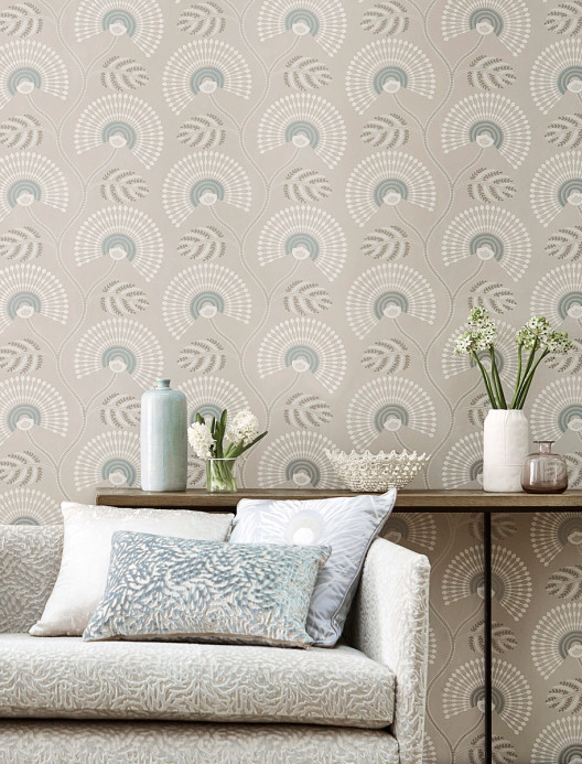 Die Tapete zeigt ein stilisiertes Blütenmuster mit dynamischem Schwung. Die harmonische Farbwahl und die klare Struktur verleihen der Wand eine besondere Raffinesse.