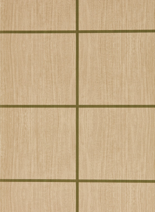 Die Tapete zeigt eine getäfelte Holzoptik im Faux-Bois-Stil, inspiriert von traditionellen japanischen Wohnräumen. Ein Glanzdetail im Muster unterstreicht die Struktur und lässt die Tapete wie eine handgefertigte Holzverkleidung wirken.