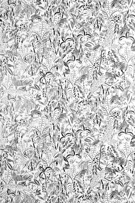 Das Design der Tapete zeigt ein grafisches Muster, das in Wohn- und Schlafräumen eine äußerst künstlerische Wirkung besitzt. Blumen, Palmenblätter und Gräser sind miteinander verflochten und ergeben ein detailliertes Design. Darin lassen sich abstrakte Figuren sowie Leoparden und Kolibris erkennen, die exotische Akzente an der Wand setzen.