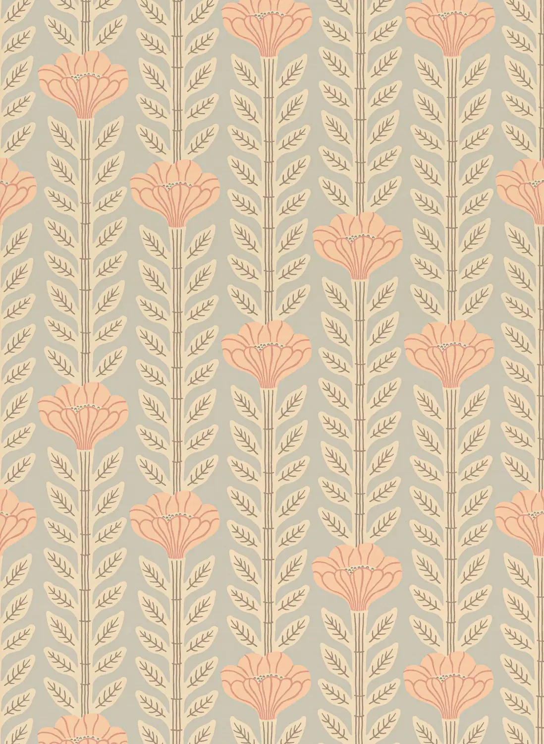 Die typisch schwedische Vintage-Tapete zeigt ein verspieltes Muster aus kleinen, geschwungenen Blattformen. Ihre weiche Farbgebung verleiht dem Raum Leichtigkeit und einen frischen, belebenden Charakter.