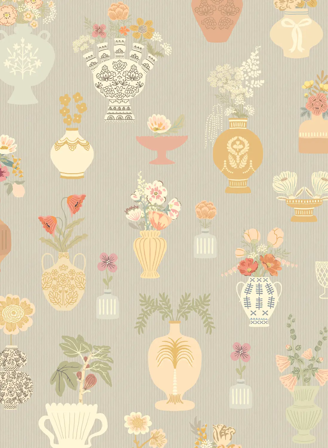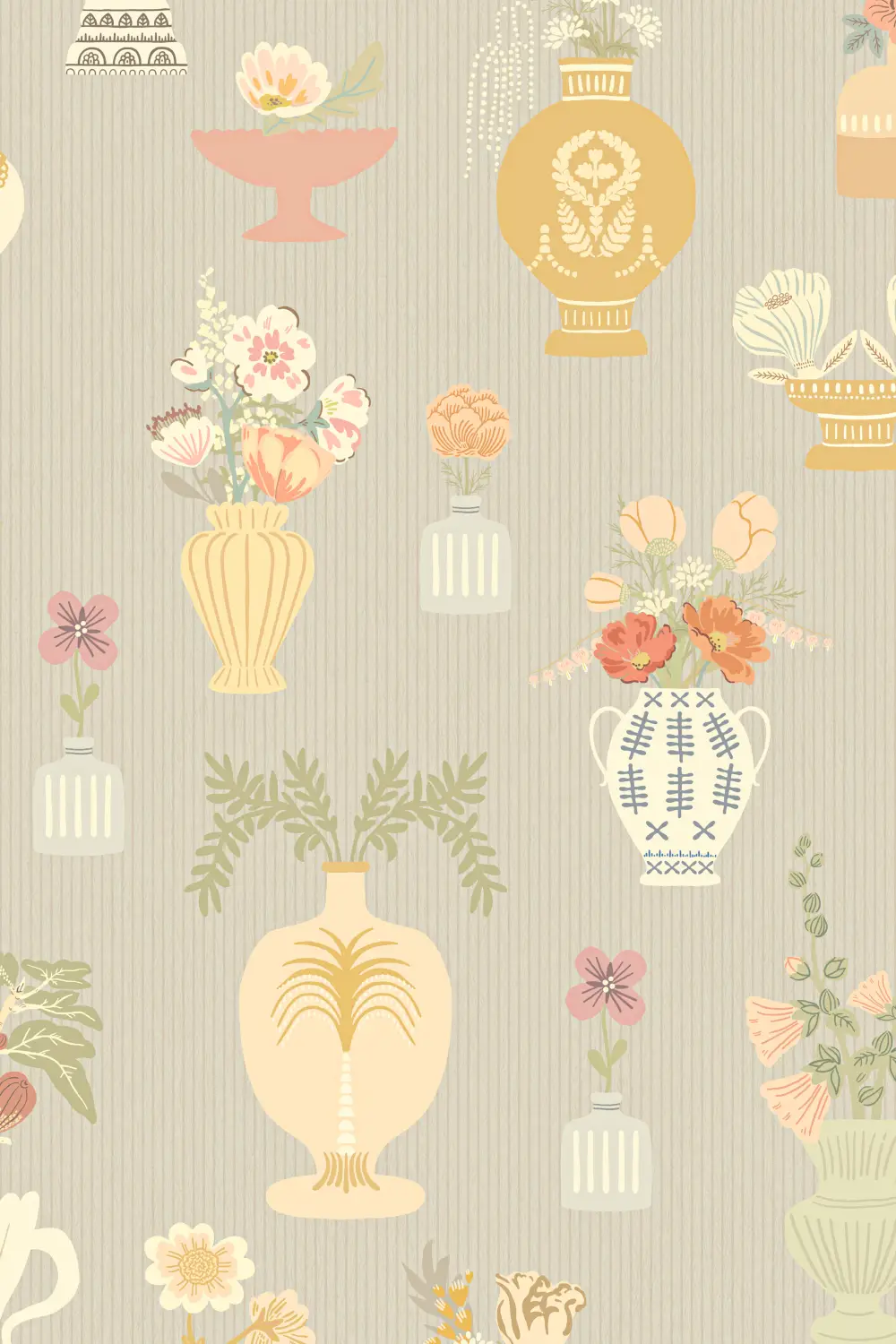 Die typisch schwedische Vintage-Tapete zeigt eine Vielzahl stilisierter Vasen, die mit Blumenarrangements gefüllt sind. Das zarte Farbspiel sorgt für eine lebendige, fröhliche Atmosphäre und bringt Leichtigkeit in den Raum.