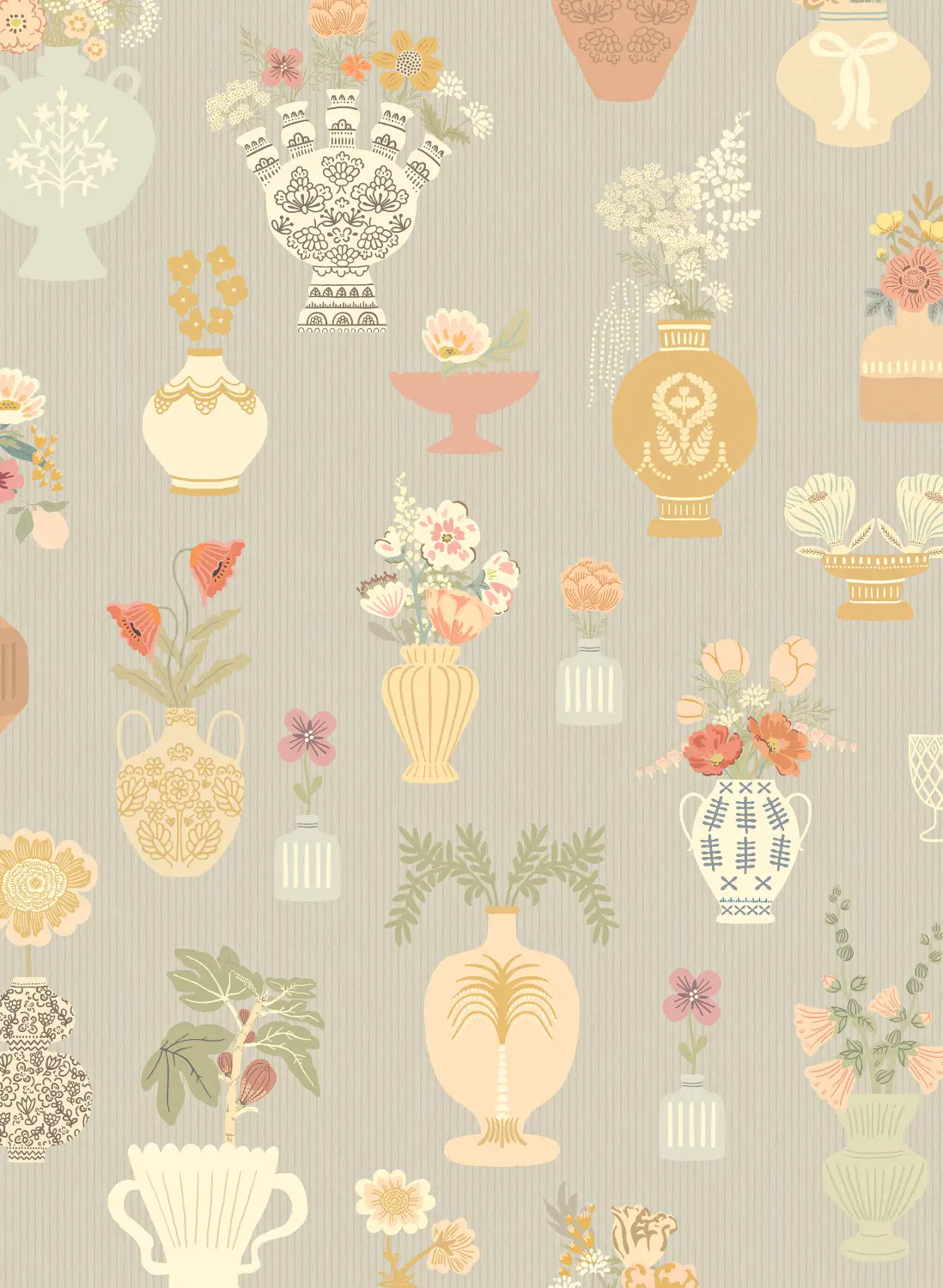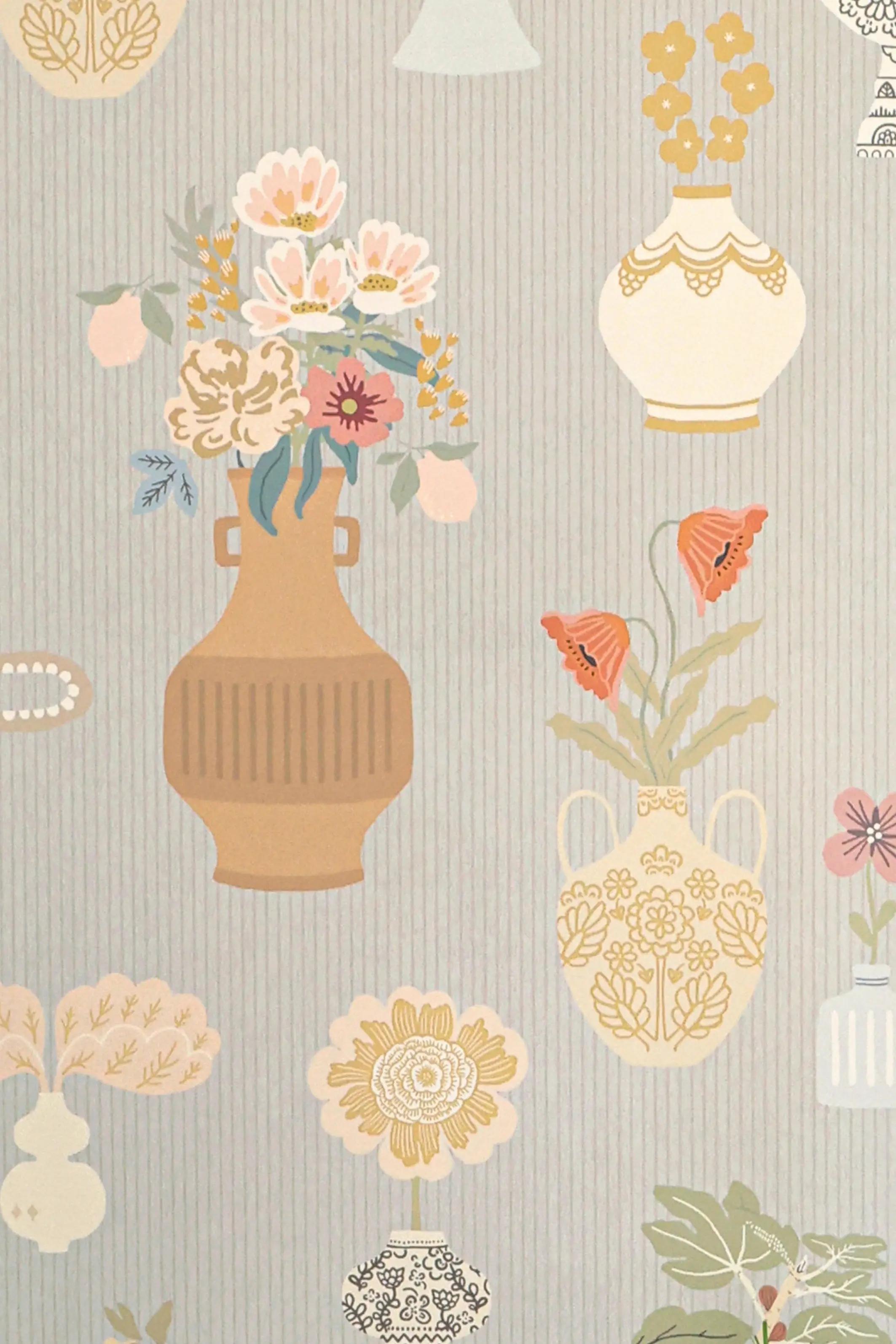 Die typisch schwedische Vintage-Tapete zeigt großformatige Blumenvasen mit fein ausgearbeiteten Details. Durch die sanften Töne entsteht ein dekorativer Blickfang, der dem Raum Großzügigkeit und Wärme verleiht.