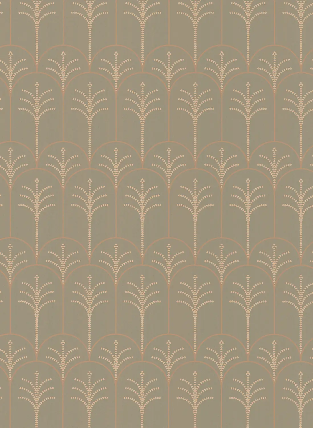 Die Tapete zeigt ein rhythmisches Muster aus halbrunden, sich wiederholenden botanischen Formen. Durch den harmonischen Farbverlauf der typisch schwedischen Vintage-Tapete entsteht eine ruhige, moderne Wirkung, die ideal für stilvolle Wohnräume ist.