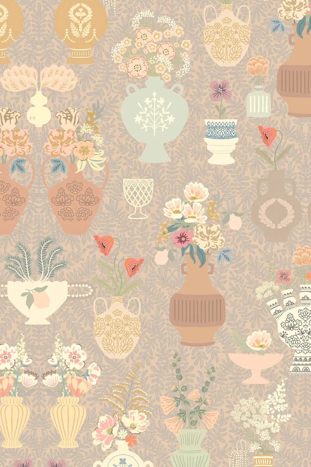 Die Tapete zeigt ein harmonisches Muster aus üppigen Blumenvasen, das durch feine Linien und helle Farben belebt wird. Zusammen mit ihrer typisch schwedischen Vintage-Farbgebung verleiht sie dem Raum eine frische, sommerliche Ausstrahlung und wirkt zugleich elegant und verspielt.