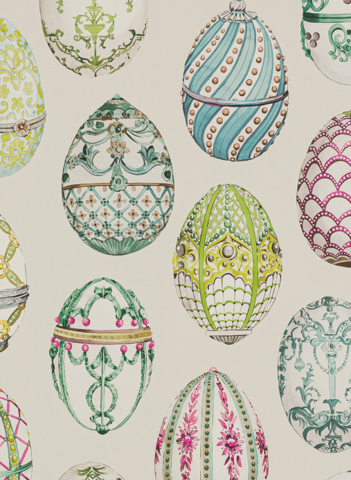 Das Muster der Tapete besteht aus exquisiten Schmuckeiern, die von den berühmten Kreationen von Fabergé inspiriert sind. Das von Hand gemalte Design wurde mit Aquarelltechnik umgesetzt und mit feinen Details versehen. Während die aufwändigen Ornamente der Wand eine elegante und luxuriöse Optik verleihen, sorgt die geometrische Anordnung des Motivs für Ordnung und Struktur. Das Design macht die Wand in Wohn- und Schlafräumen zu etwas ganz Besonderem.