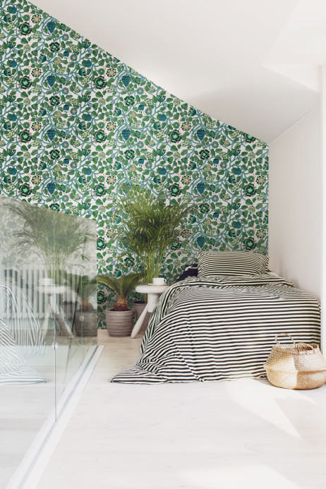 Die botanische Tapete zeigt ein lebhaftes Design aus wunderschönen Blumen, die von belaubten Zweigen umgeben sind. Das Muster verleiht der Wand eine frische und zeitlose Optik und lässt eine freundliche und unbeschwerte Atmosphäre in Wohn- und Schlafräumen entstehen.