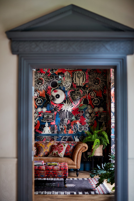 Das Design der Tapete ist inspiriert von den legendären Festivaltagen in Woodstock und eignet sich für eine Statement-Wand. Großformatige Illustrationen von Schallplatten, Musikinstrumenten, Blumen, Herzen und Sonnen, die den Charme des Woodstock-Festivals aufleben lassen, fügen sich in einen farbintensiven Hintergrund ein und sorgen für extravagante Akzente in Wohn- und Schlafräumen.