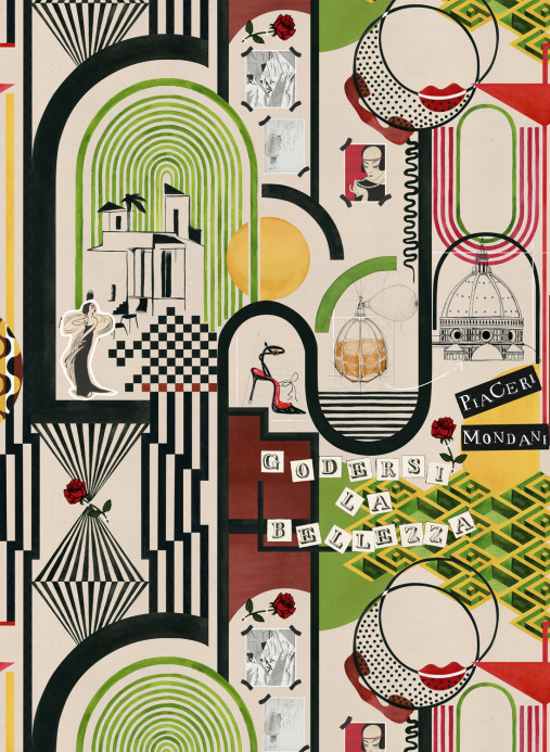 Die Tapete zeigt elegant gekleidete Figuren, blühende Rosen und architektonische Wunder. Die Elemente erinnern an Art-Déco-Design. Das Muster lädt ein die elegante Raffinesse Italiens zu entdecken.