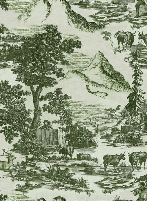 Das Design der Tapete greift ein traditionelles französische Toile-de-Jouy-Motiv des 18. Jahrhunderts auf und interpretiert es mit einem Tiroler Touch neu. Zu sehen ist eine typisch alpine Landschaft mit Bergen, Wäldern, Bauern und Kühen, die in einer weichen, zweifarbigen Palette gehalten ist. Dadurch entsteht eine kunstvolle Atmosphäre in Wohn- und Schlafräumen.