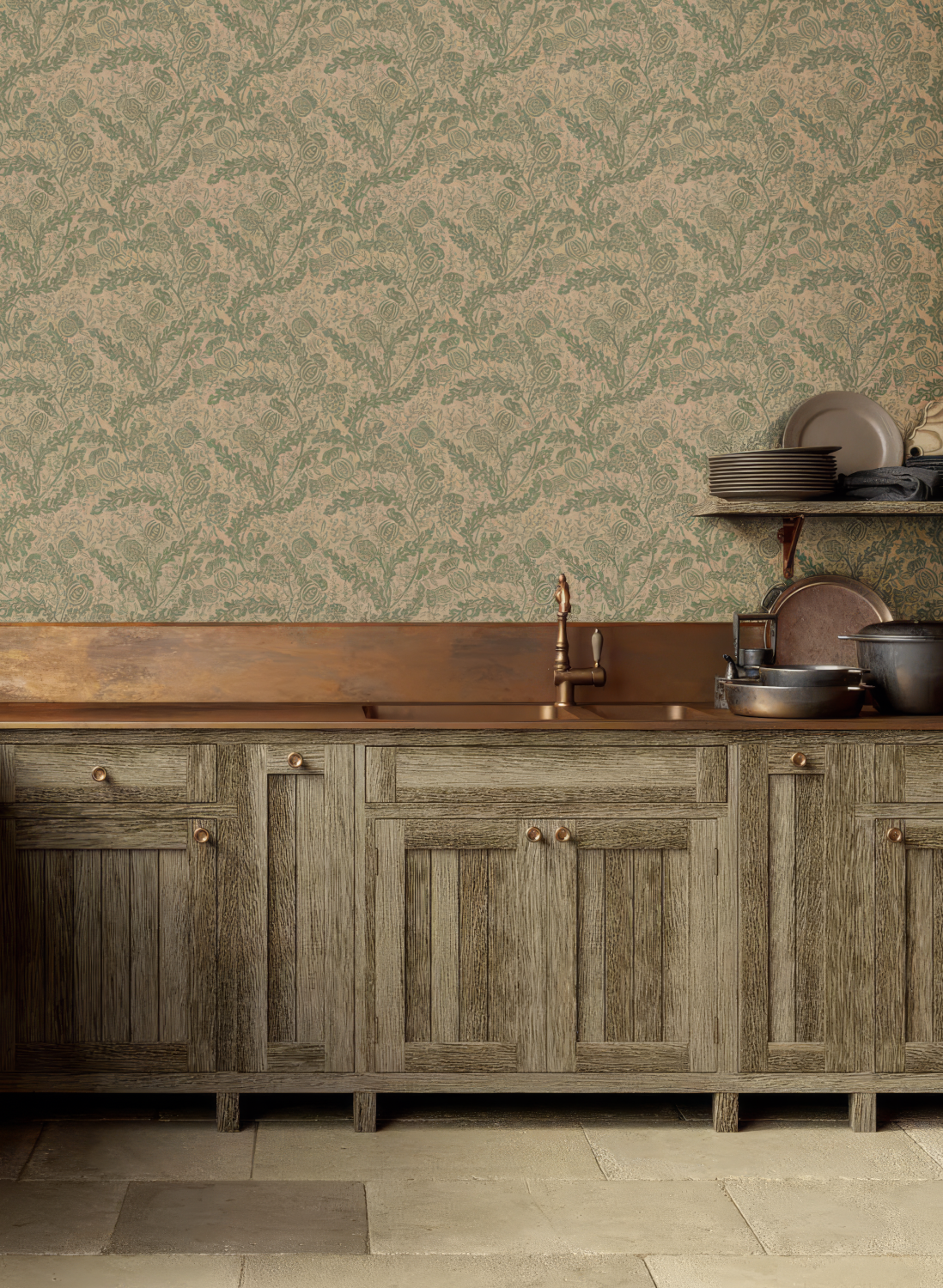 Die Tapete zeigt ein detailreiches, flächiges Muster aus geschwungenen Blättern, Blüten und Distelformen, die ineinandergreifen. Die dichte Anordnung verleiht dem Raum Tiefe und sorgt für eine warme, traditionsreiche Atmosphäre.