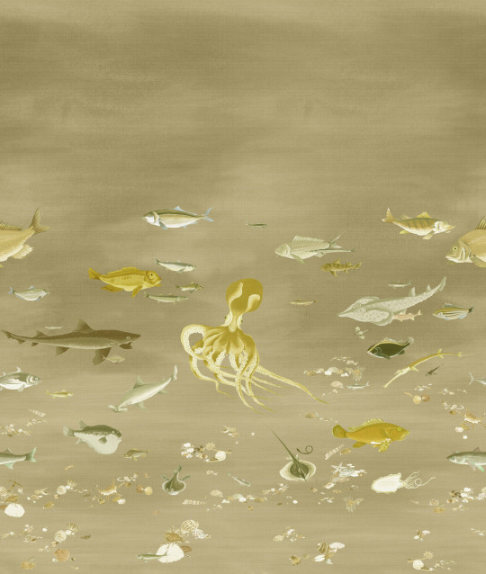 Das Motiv des in Matt ausgeführten Wandbildes ist inspiriert von der Bilderwelt des japanischen Malers Ito Jakuchu aus dem 18. Jahrhundert. Hier schwimmen Fische, Tintenfische und Muscheln auf einem optisch leicht strukturierten Hintergrund, der an Seide erinnert.