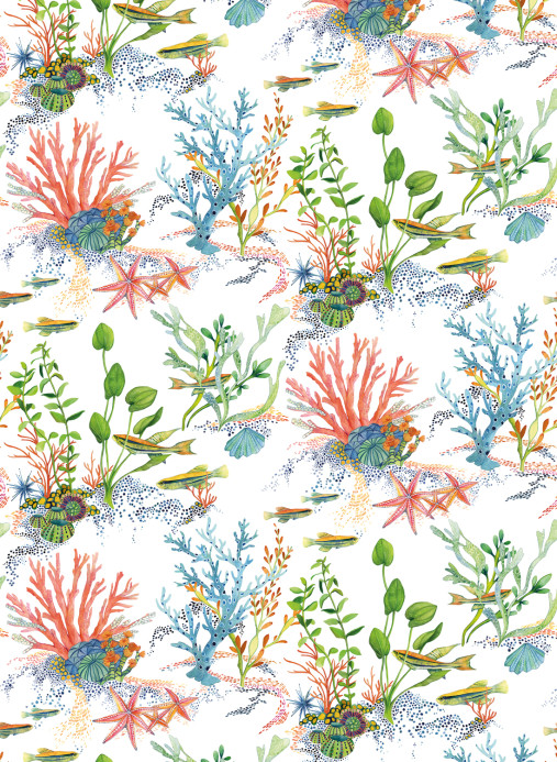 Die maritime Tapete zeigt eine Unterwasserlandschaft mit Korallen, Seegras, Seeanemonen, Seesternen, Muscheln und Fischschwärmen. Das Motiv ist auf einen metallisch glänzenden Untergrund gedruckt.