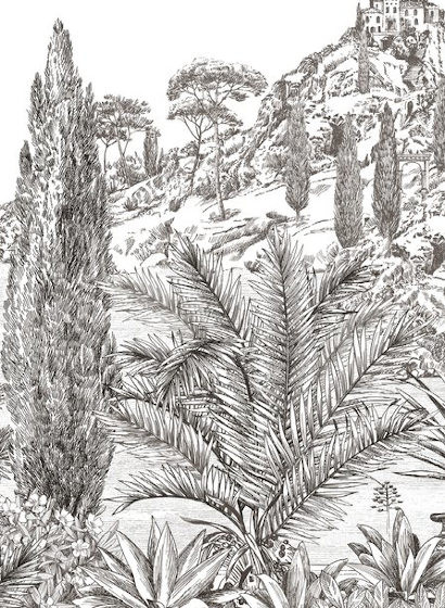 Das im Retro-Stil gezeichnete Panorama-Wandbild erweitert optisch den Raum, indem es den Blick durch Bäume auf eine mediterrane Küstenlandschaft hin öffnet.