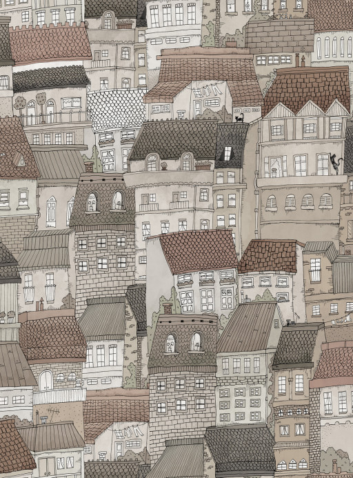 Die Tapete zeigt ein handgezeichnetes Motiv vieler entzückender Häuser, die dicht nebeneinander stehend eine traumhafte Stadt bilden. Die aufwendigen Details des Designs regen die Fantasie an und es scheint, als würde man von oben auf die Stadt hinabblicken. Die markante Tapete erzeugt Tiefe und eine besondere Dynamik in Wohn-, Schlafräumen und Kinderzimmern.