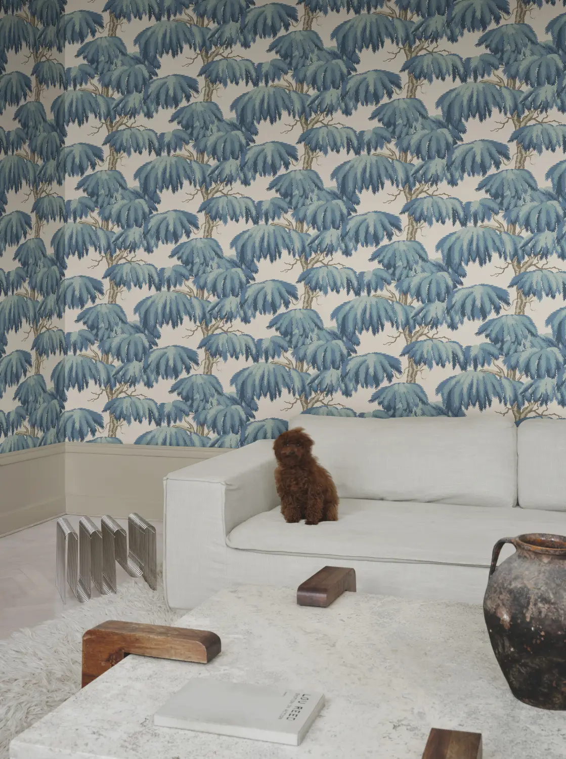 Die Tapete zeigt ein dichtes Muster aus üppigem Blattwerk. Der helle Hintergrund hebt die Struktur der Blätter und Äste deutlich hervor. Sie ist inspiriert von den majestätischen libanesischen Zedern in der Umgebung von Como und wurde von der bekannten schwedischen Designerin Karolina Kroon in typisch schwedischem Stil umgesetzt.