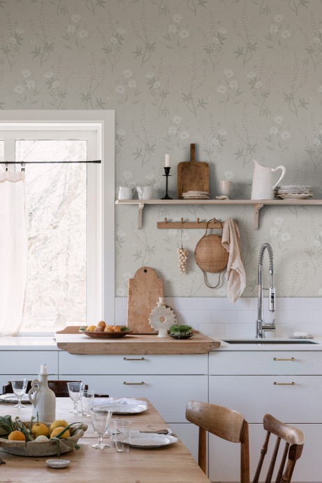 Die wunderschöne Blumentapete zeigt eine blühende Sommerwiese mit Lupinen und Mohn. Das Design verleiht der Wand einen sommerlichen und lebhaften Charakter und erzeugt eine warme skandinavische Atmosphäre in Wohn- und Schlafräumen.
