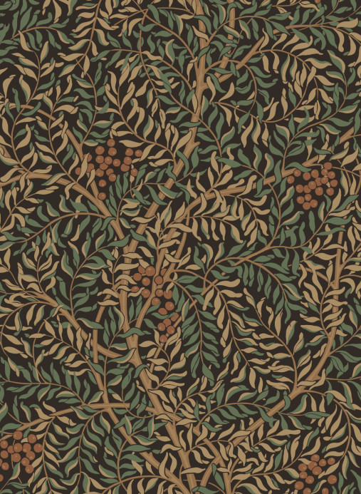 Die Tapete zeigt ein harmonisches Muster aus verschlungenen Zweigen der Vogelbeere. Es wurde im typischen skandinavischen Landhausstil umgesetzt sorgt für eine einladende, natürliche Atmosphäre im Raum.