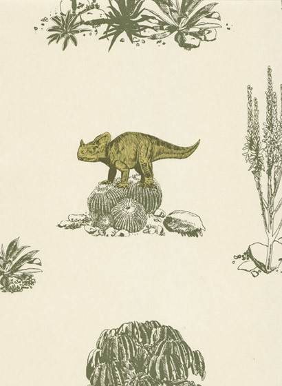 Diese Tapete überrascht und erfreut sowohl Kinder als auch Erwachsene. Sie zeigt eine skurrile Landschaft aus Wüstenkakteen und darin umherwandernden Dinosauriern in liebevoller Gestaltung und harmonischen Farbgebungen.