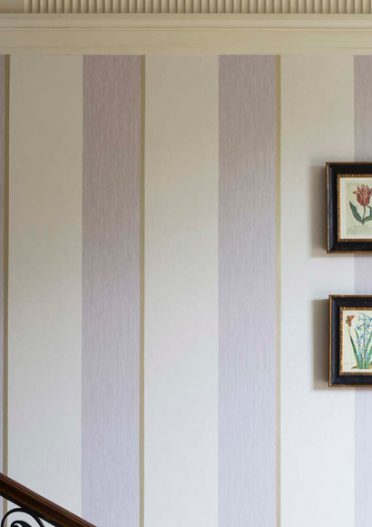 Benannt nach der kleinen königlichen Residenz Louis XIV. zeichnet sich Marly durch einen elegant-breiten, malerischen Streifen in Kalkfarben von Lavendel, Taubenei, Gelb und Hellblau aus. Dekoriert werden die Streifen mit feinen Bändern von Metalltönen in Gold und Bronze.