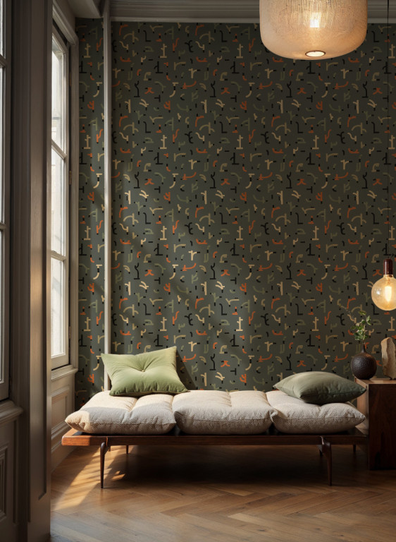 Die Tapete zeigt ein rhythmisch angeordnetes Muster aus Menschen in unterschiedlichen Posen. Sie ist von Frühlingsspaziergängen unter mediterraner Sonne inspiriert und verleiht dem Raum eine lebendige, dynamische Atmosphäre mit kreativem Flair.