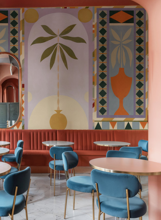 Die Panoramatapete zeigt ein geometrisches Muster aus farbigen Flächen und überlagernden Formen. Die Komposition ist von der Kunst des 20. Jahrhunderts inspiriert und verleiht dem Raum eine moderne Struktur.